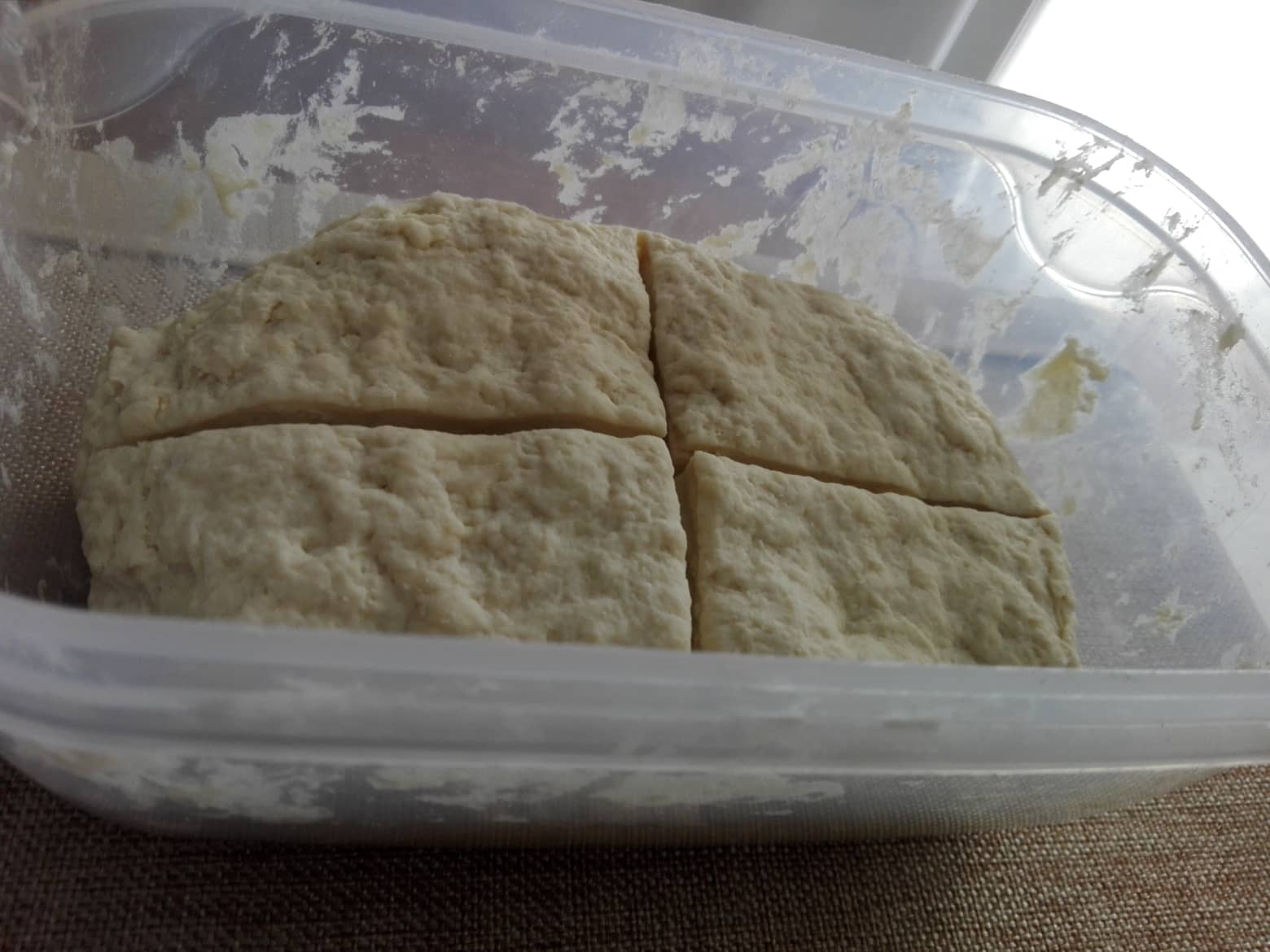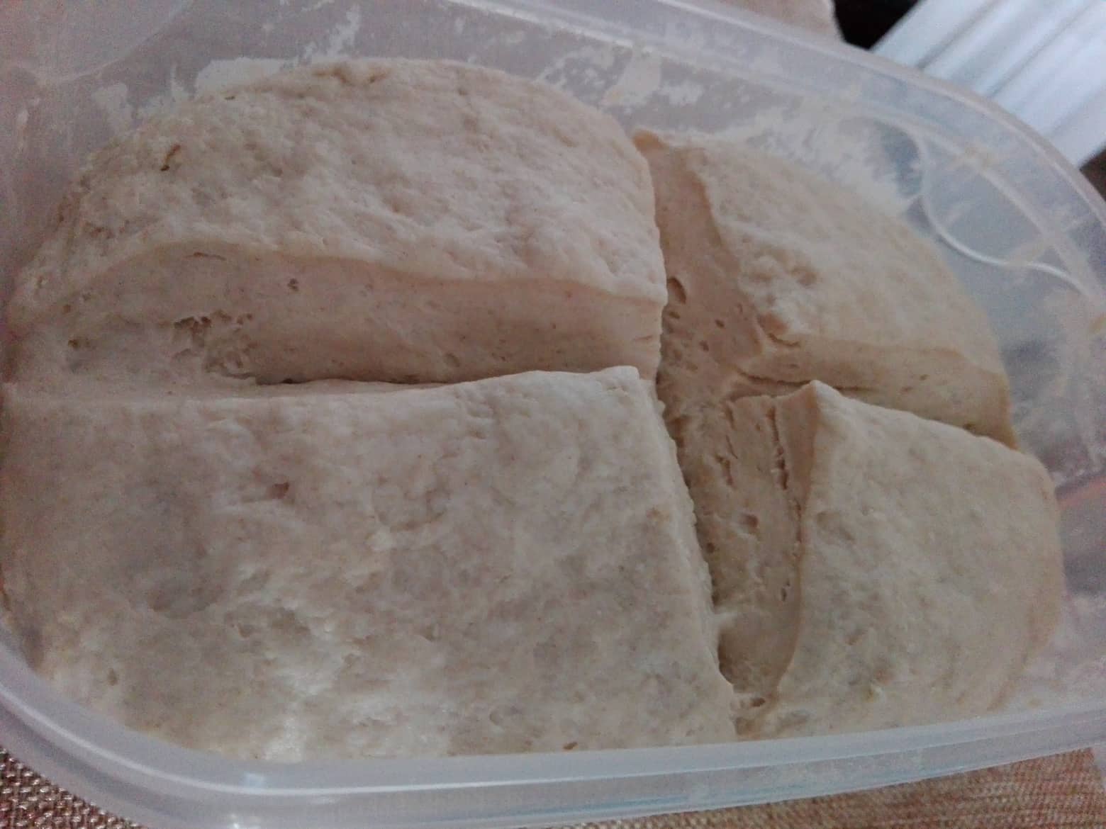 Preparare il preimpasto con 300 ml di kefir di latte pronto da bere (deve essere almeno di due giorni e a temperatura ambiente, quindi toglietelo un po’ prima dal frigo) e 500 grammi di farina 0, impastare per bene e lasciare lievitare coperto fino al raddoppio come si vede in foto. Una volta raddoppiato (circa 6 ore a 20 gradi) si può usare subito oppure riporre in frigo e usarlo il giorno dopo avendo l’accortezza di farlo acclimatare prima dell’ utilizzo